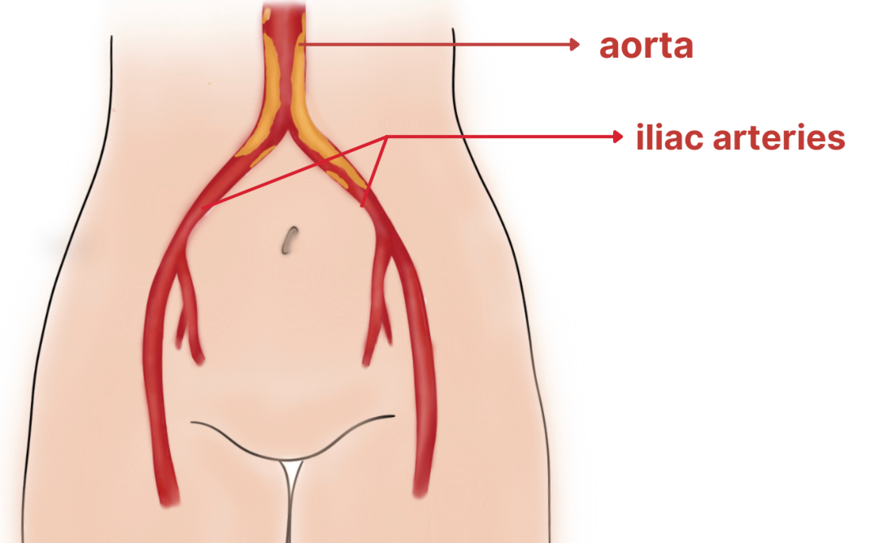 The aorta is a major artery that comes off the heart and travels down the abdomen and branches into the iliac arteries to supply the legs with blood. When plaque builds up in these arteries, it can reduce blood flow to other regions of the body, and result in leg pain and erectile dysfunction in men.