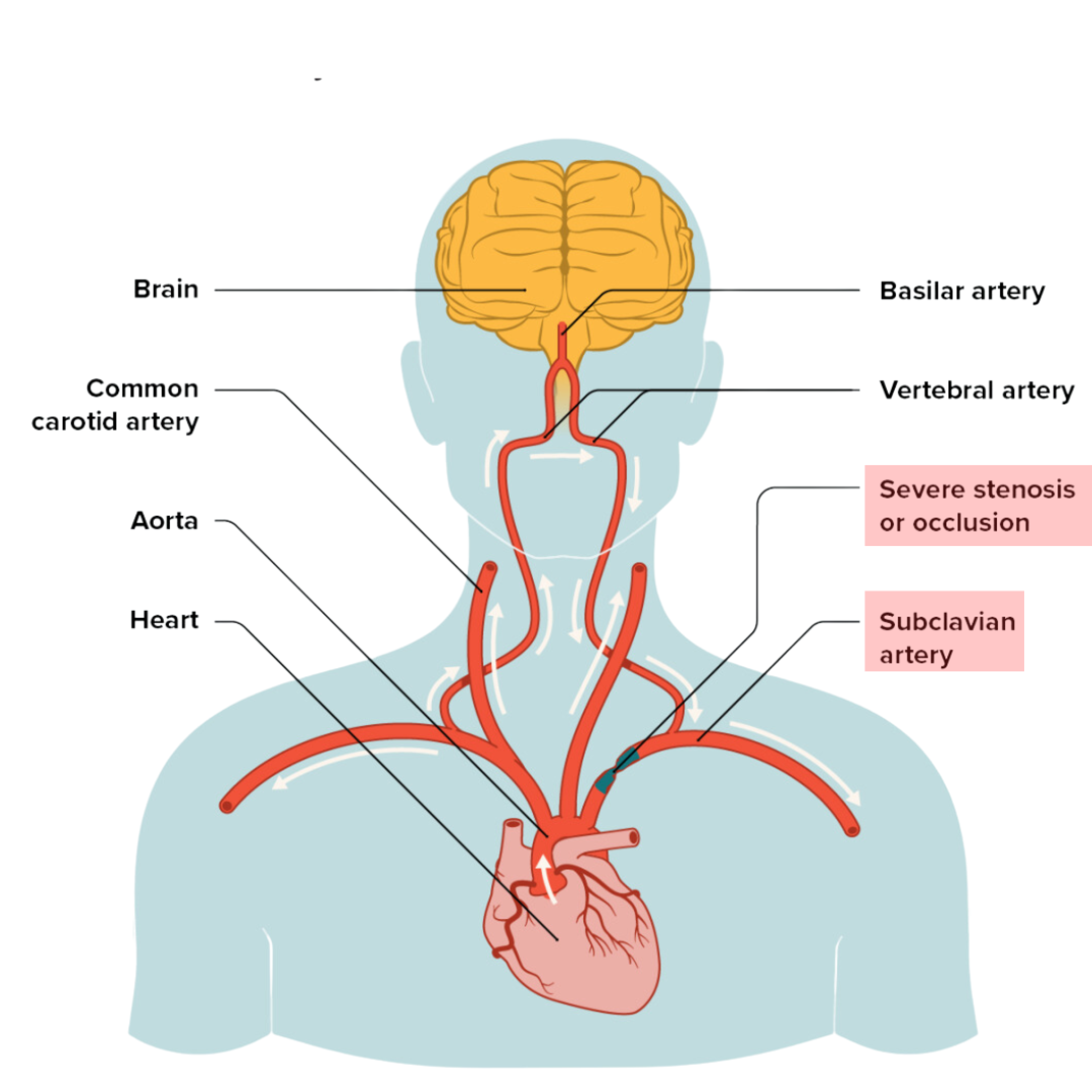Most patients present with stenosis of their left subclavian artery, which branches directly off of the aorta, the main artery coming from the heart. The right subclavian artery originates from a different artery.