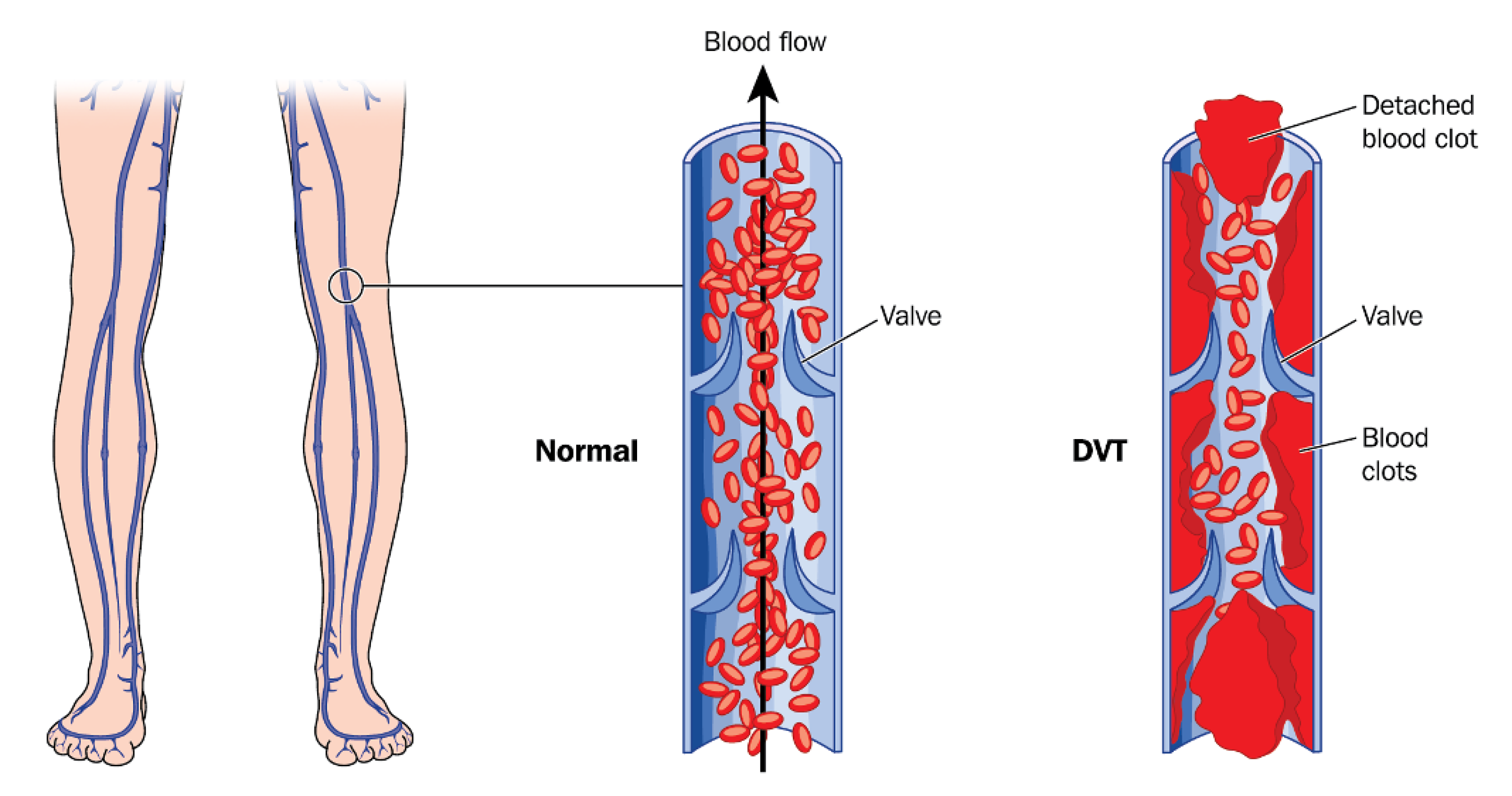 A deep vein thrombosis (DVT) is a blood clot that occurs in the veins. The clot can either partially or fully block the vein from being able to transport blood out of the legs. This causes symptoms in the legs such as swelling, skin tightness, and heaviness. A venous clot can also break off of the vein and travel to the lungs causing a life threatening condition called pulmonary embolism.
